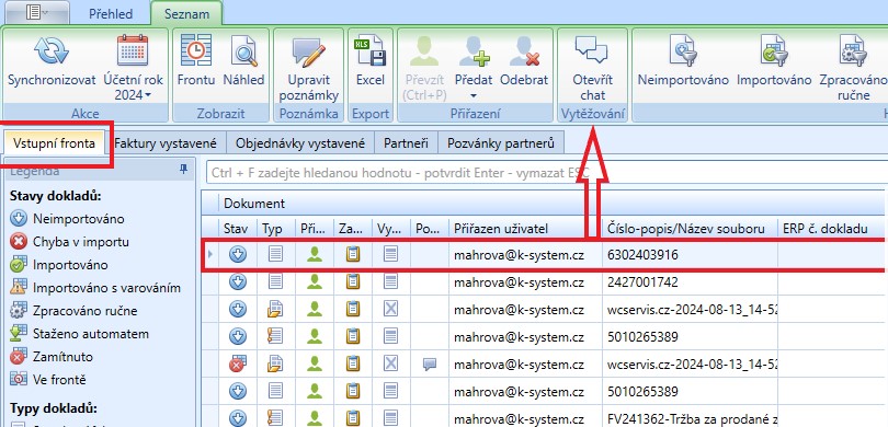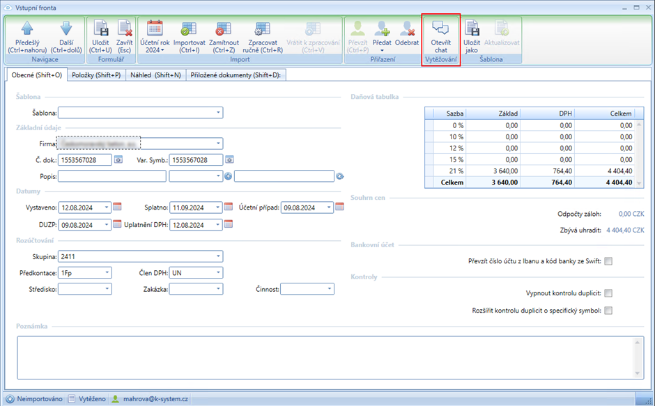 Při zpracování vytěžené faktury má zpracovatel možnost v případě potřeby zahájit chat s obsluhou vytěžování prostřednictvím ikony „Otevřít chat“.