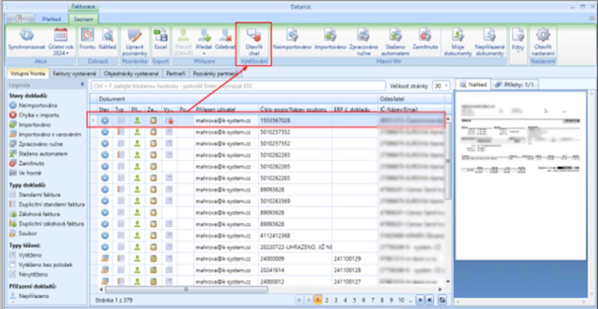 Zahájení chatu zpracovatelem faktury v desktopové části aplikace
