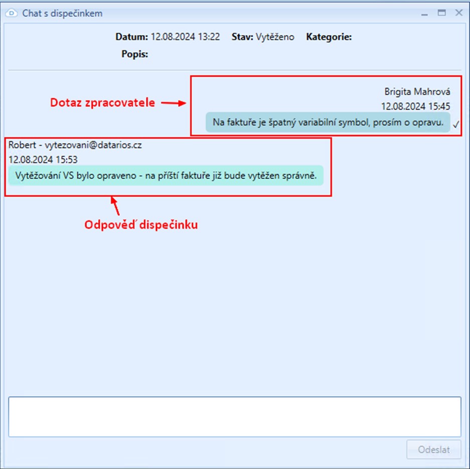Odpověď obsluhy dispečinku je zobrazena v chatovacím okně.