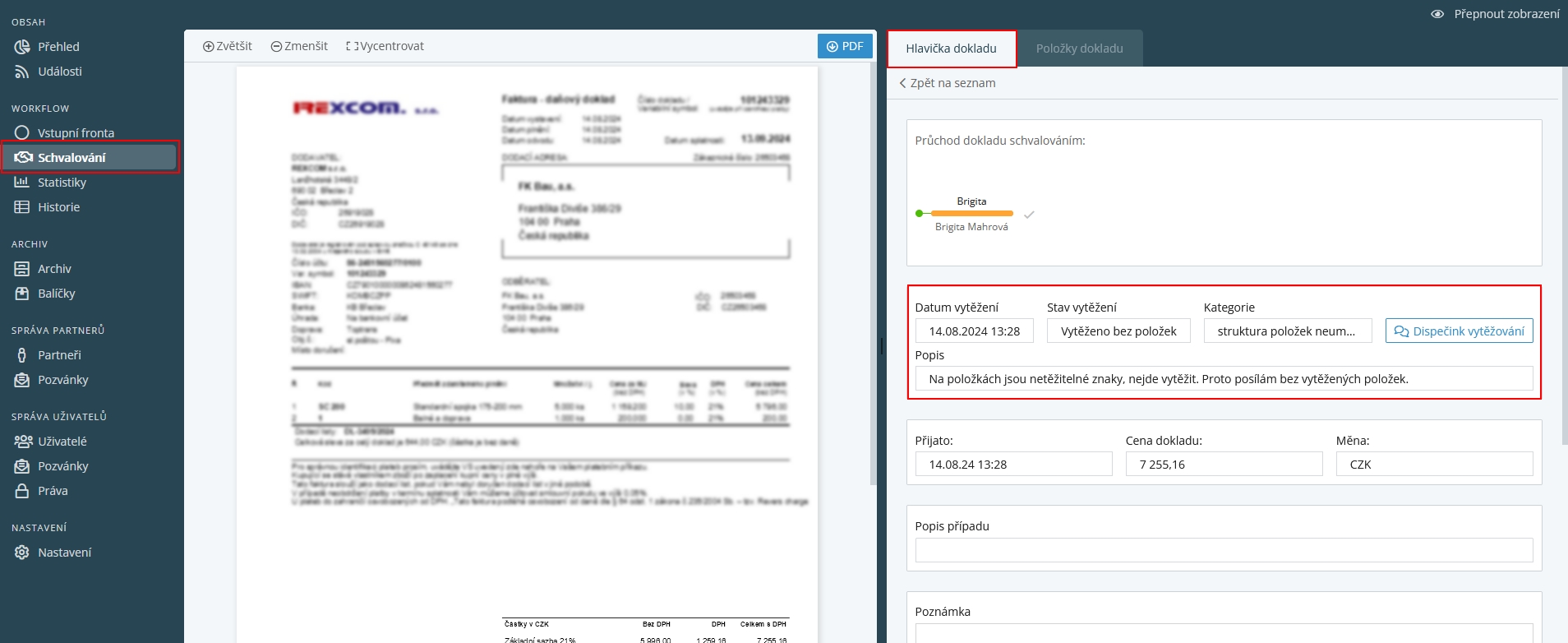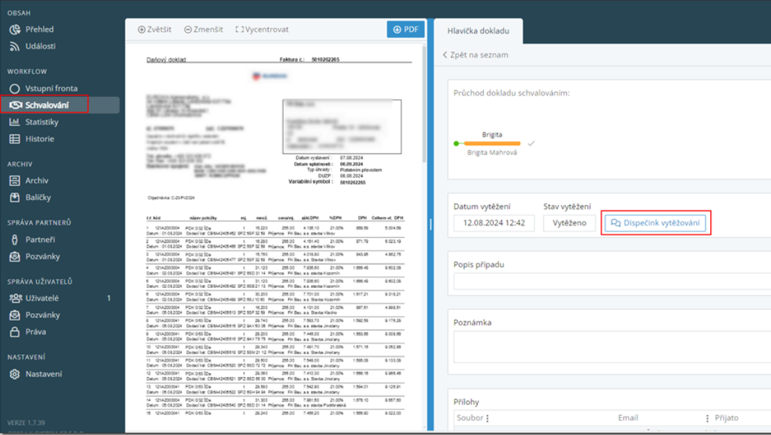 Při zpracování dokladu má schvalovatel možnost v případě potřeby zahájit chat s obsluhou vytěžování prostřednictvím tlačítka „Dispečink vytěžování“, které otevře chatovací okno.