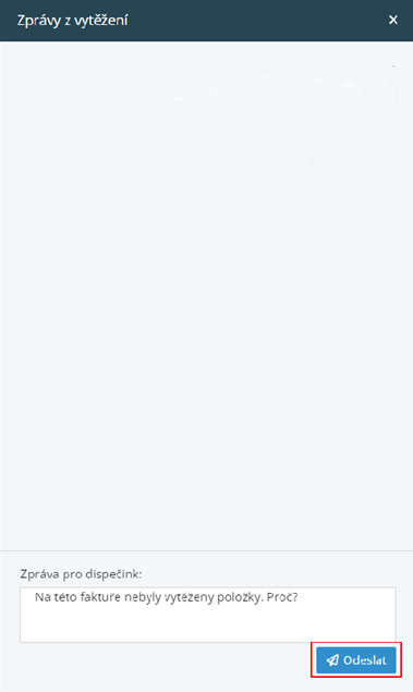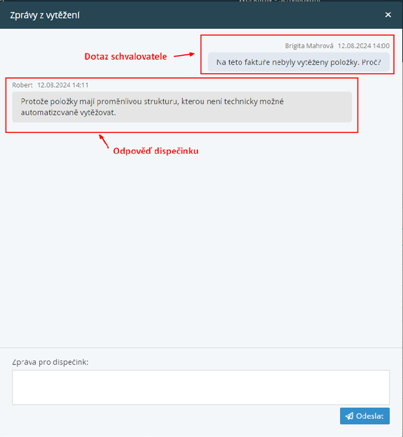Jedná se o komunikační chat mezi dispečinkem vytěžování a zpracovatelem faktury.