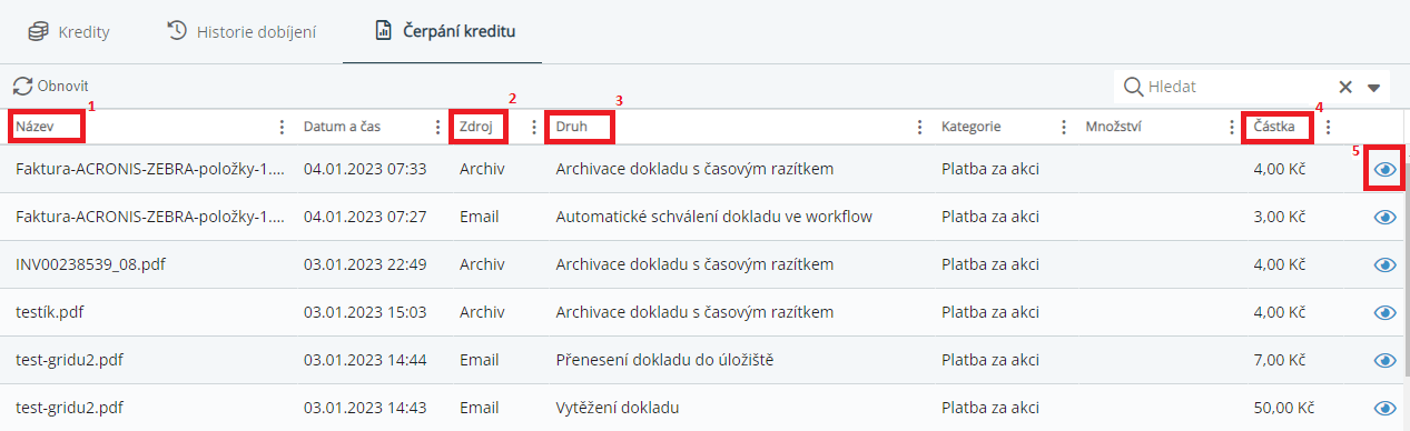 Přehled o provedených odečtech kreditů. Umožňuje hledat podle názvu dokumentu (1), zdroje (2), druhu odečtu (3) a částky (4). Zahrnuje také náhled na dokument (5), kterého se odečet týkal.