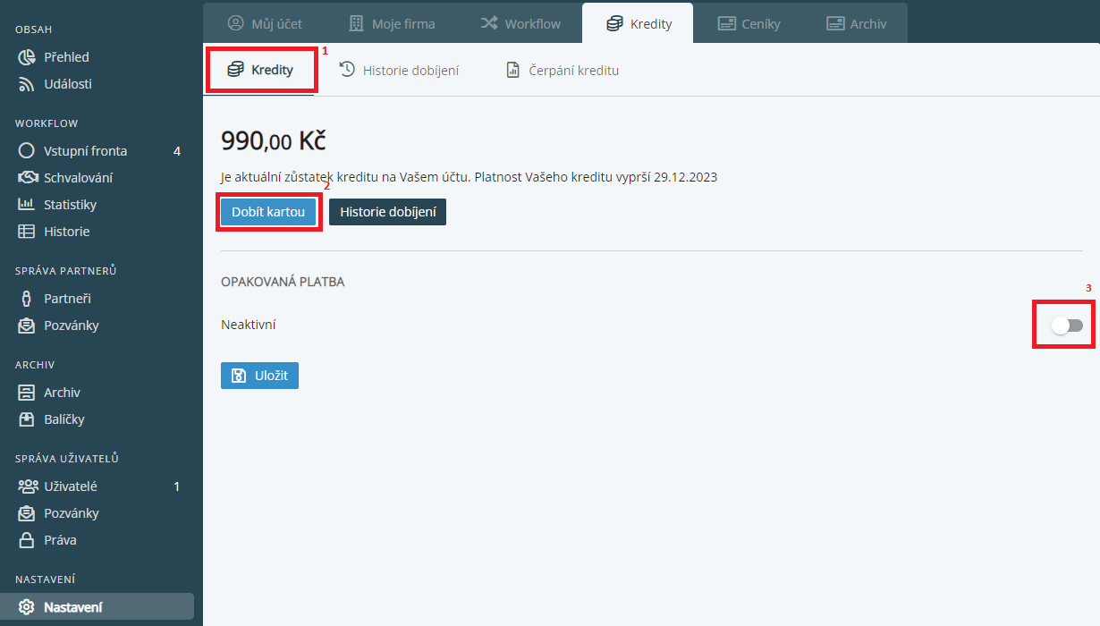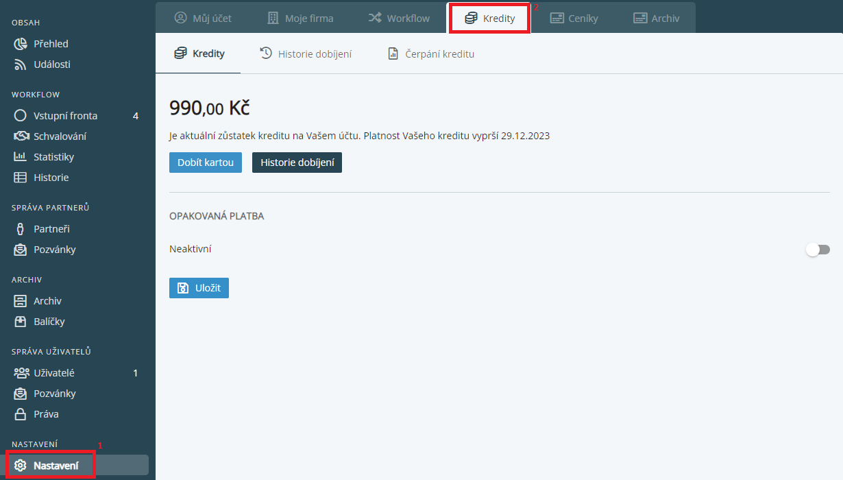 Aktuální stav kreditu se nachází pod záložkou Kredity (1).