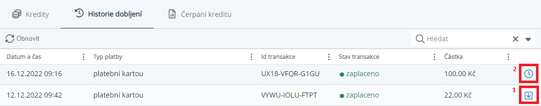 Faktura za dobití kreditu je po zaplacení automaticky odeslána na email uživatele, který dobití kreditu zadal. Kopie dokladu se nachází pod záložkou Historie dobíjení: ke stažení (1), doklad se vytváří (2).