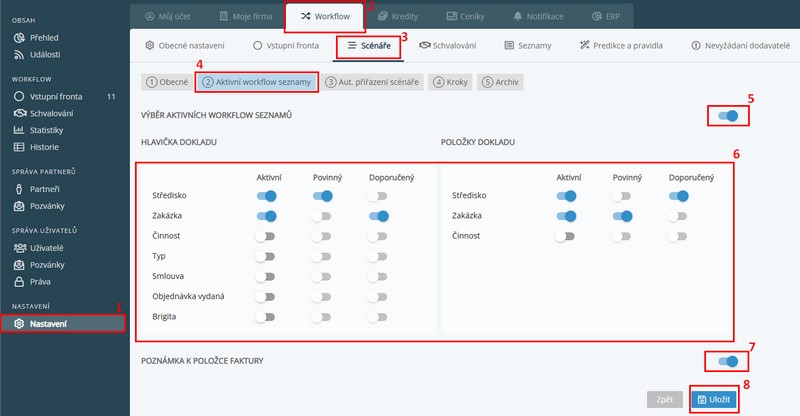 Výběr aktivních Workflow seznamů je umožněn až po aktivaci checkboxu (5).