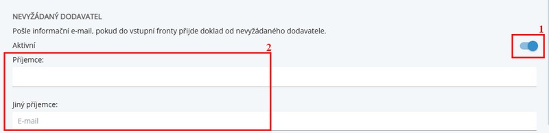 Zadaným příjemcům je zaslán informační email v případě, kdy do Vstupní fronty přijde dokument od některého z nevyžádaných dodavatelů.