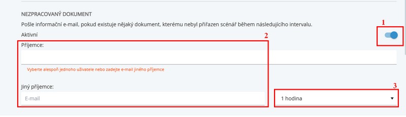 Zadaným příjemcům je zaslán informační email v případě, kdy existuje nějaký dokument, kterému nebyl přiřazen scénář během nastaveného intervalu.