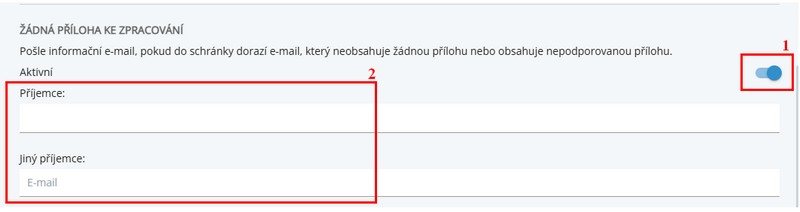 Zadaným příjemcům je zaslán informační e-mail, pokud do schránky dorazí e-mail, který neobsahuje žádnou přílohu nebo obsahuje nepodporovanou přílohu.