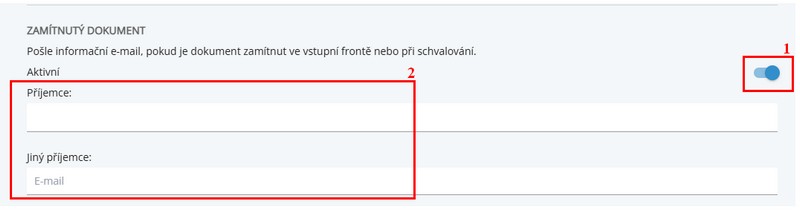 Zadaným příjemcům je zaslán informační email v případě, že je ve Vstupní frontě nebo ve schvalování nějaký dokument zamítnutý.