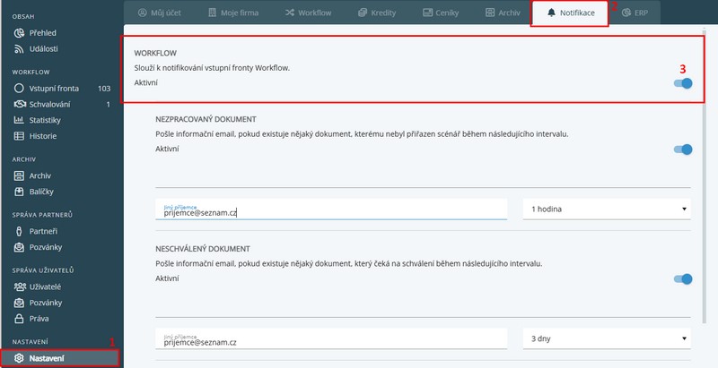 Aktivaci notifikací zapnete v menu Nastavení (1), záložka Notifikace (2) aktivací checkboxu (3).