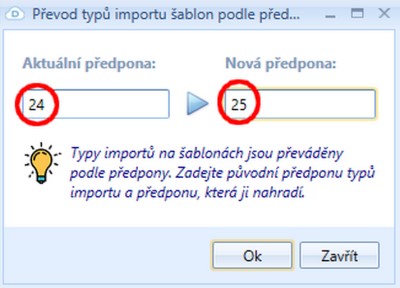 Po stisku tlačítka „Převést typy importů“ se zobrazí tabulka pro zadání převodu podle uživatelem zadaných údajů například převod z 24 na 25: