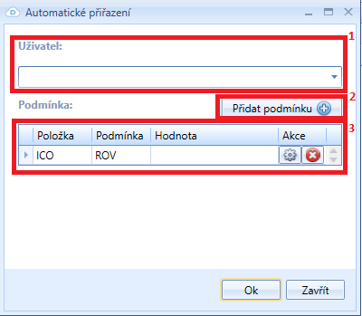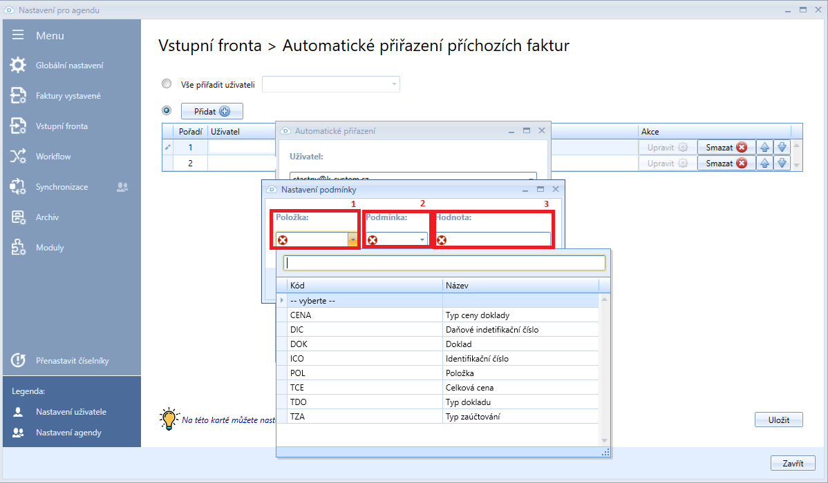 Po vyplnění emailu uživatele (1) je třeba tlačítkem Přidat podmínku (2) nastavit podmínku či podmínky (3), jejichž splnění vyústí v přiřazení příchozí faktury danému uživateli.