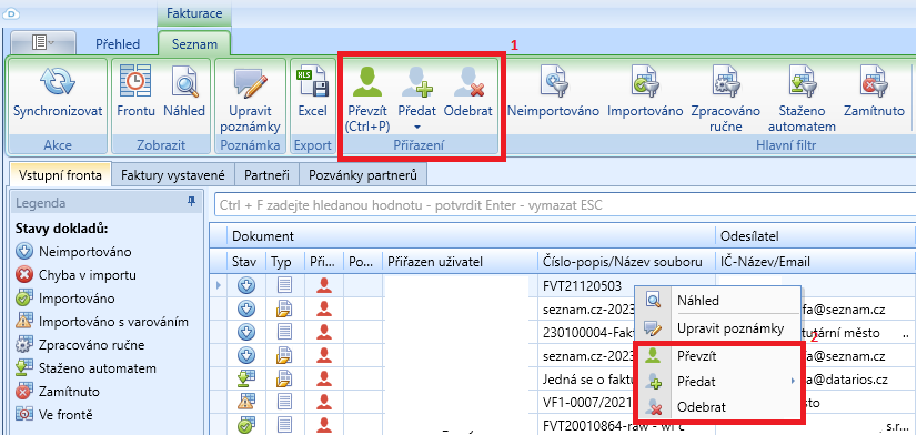 Ruční přiřazení faktury uživateli provedete ikonkou Převzít (1), popřípadě kliknutím pravým tlačítkem na dotyčnou fakturu a volbou Převzít (2).