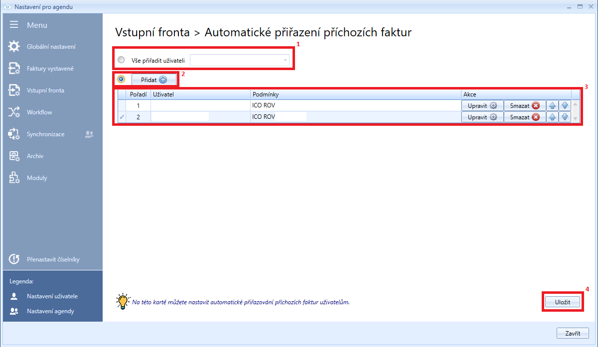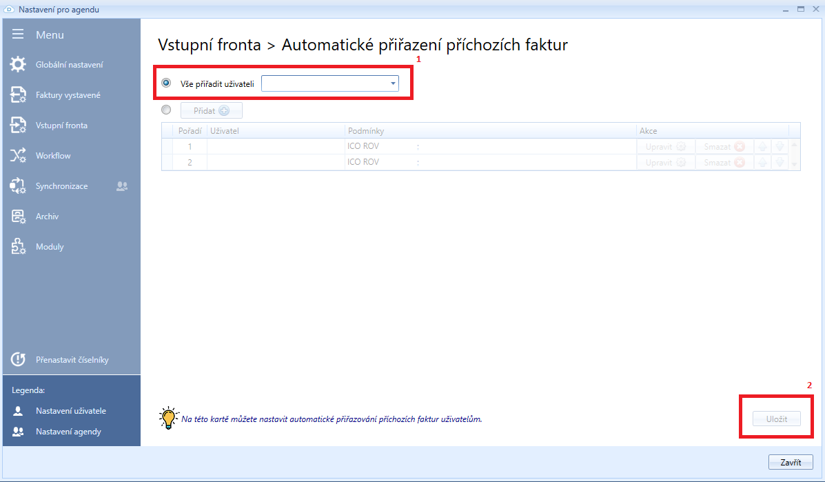 První možnost nastavení je přiřazení všech příchozích faktur jedinému uživateli (1). Provedené změny nastavení je třeba uložit tlačítkem Uložit (2).