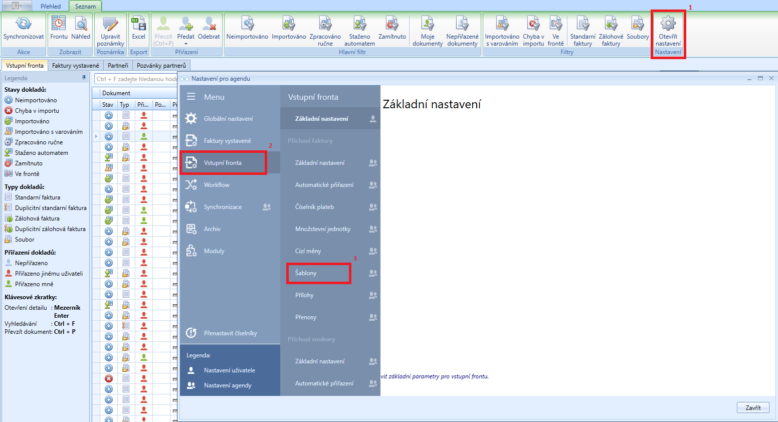 Přehled existujících šablon v desktopové aplikaci Datarios naleznete v Nastavení (1), menu Vstupní fronta (2), Šablony (3).