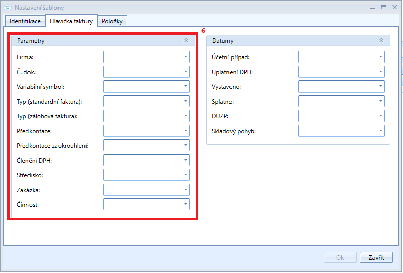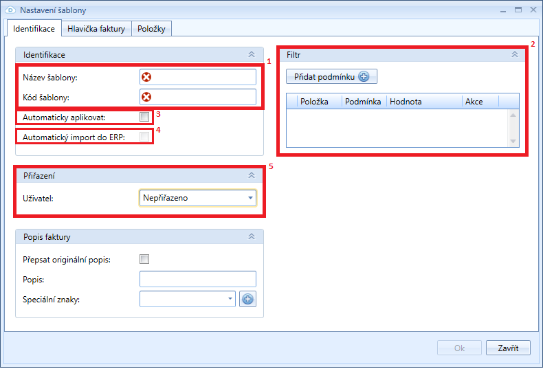Při tvorbě nové šablony je třeba zvolit název a kód šablony (1) a nastavit v oblasti Filtr (2) podmínky, které umožní identifikaci faktury. Do filtru je třeba vždy přidat firmu (ta musí být zadaná i v napojeném ERP). Jméno firmy se následně objeví v oblasti Parametry (6). Není-li nastavena firma, šablonu nelze aplikovat.