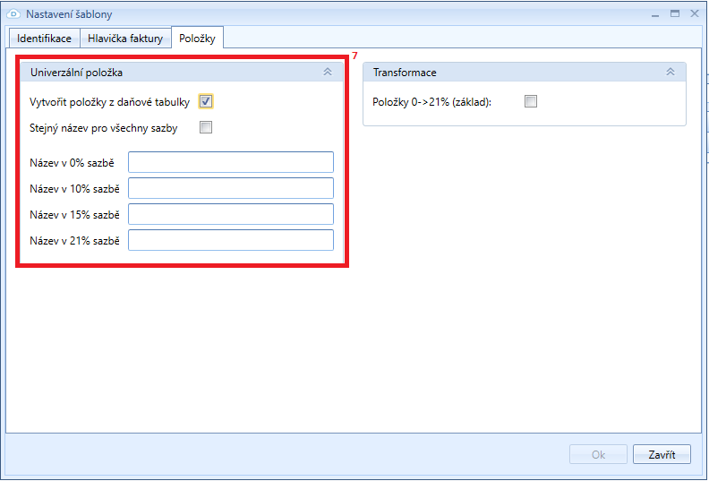V záložce Položky lze v oblasti Univerzální položka (7) umožnit vytváření položek faktury na základě daňové tabulky. Je možné nastavit stejný název pro všechny sazby nebo jednotlivě pro každou z nich.