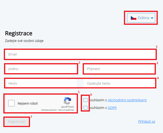 Zaškrtněte antispamovou ochranu (5) a souhlas s obchodními podmínkami a GDPR (6). Tlačítkem Registrovat (7) dokončíte registraci a na zadanou emailovou adresu bude odeslán odkaz pro ověření adresy.