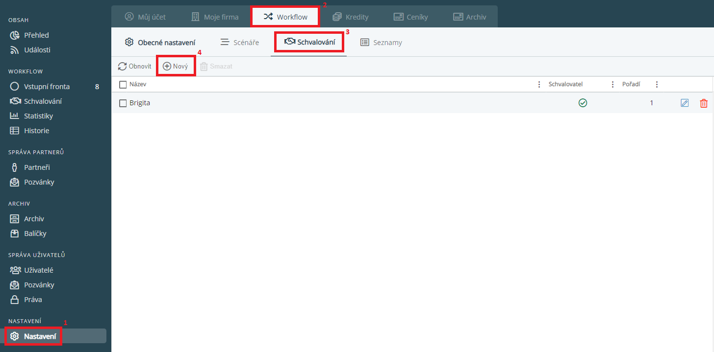 Nový scénář schvalování založíte tlačítkem Nový (4).