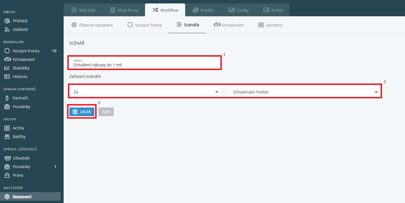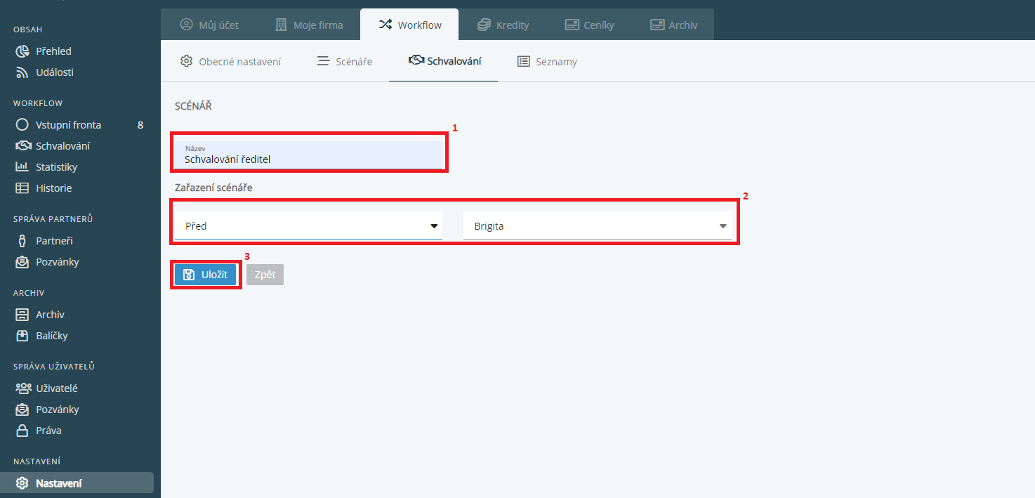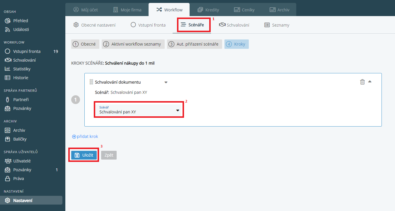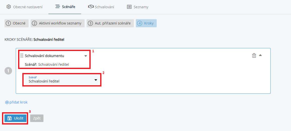 Do kroku Schvalování dokumentu (1) nyní můžete přidat vytvořený scénář schvalování (2) a uložte (3).