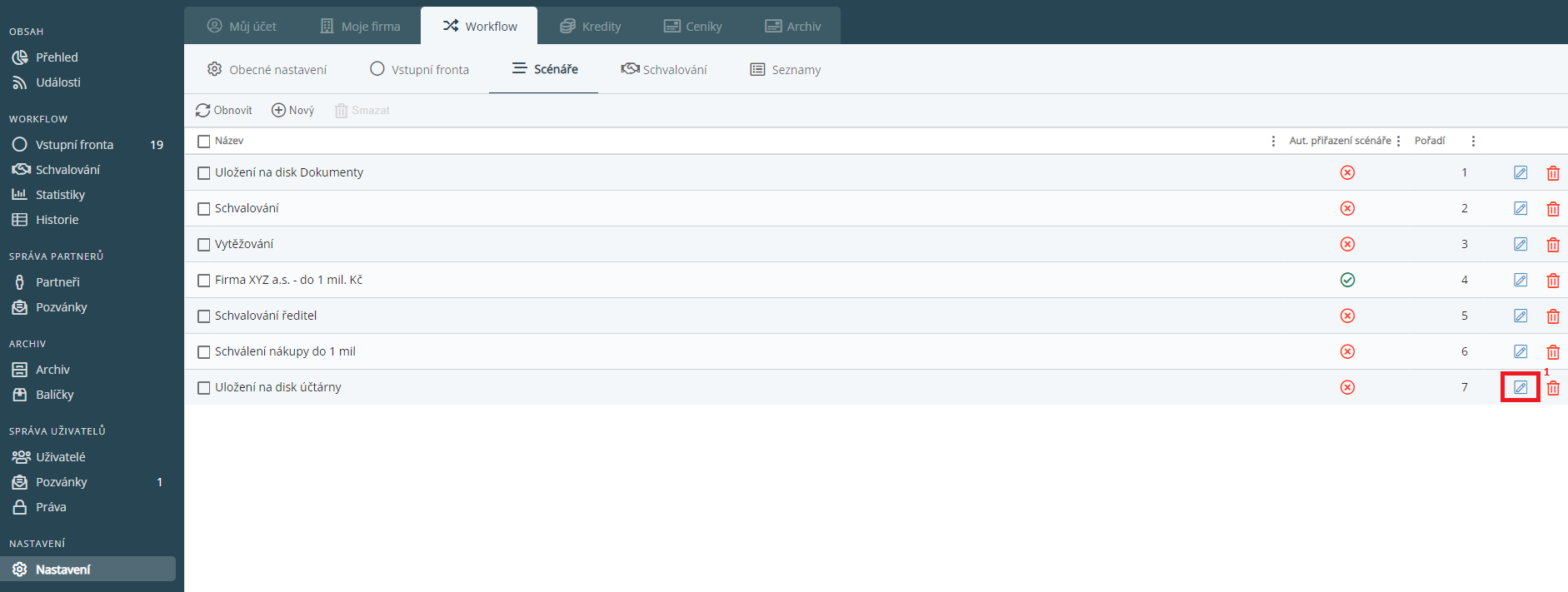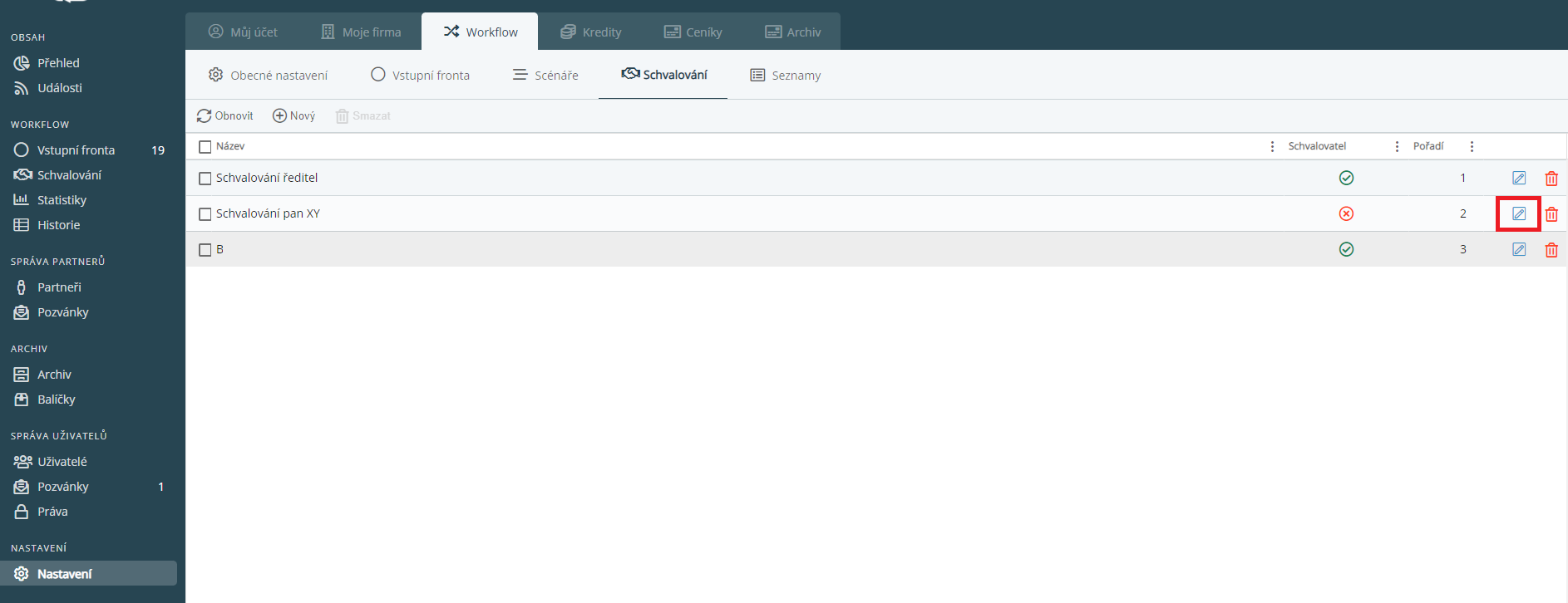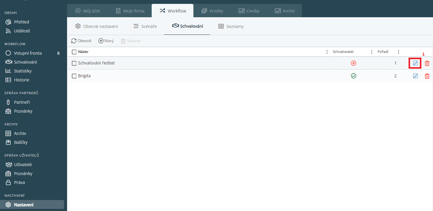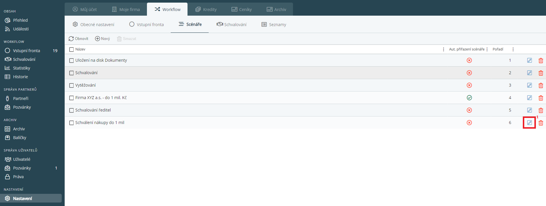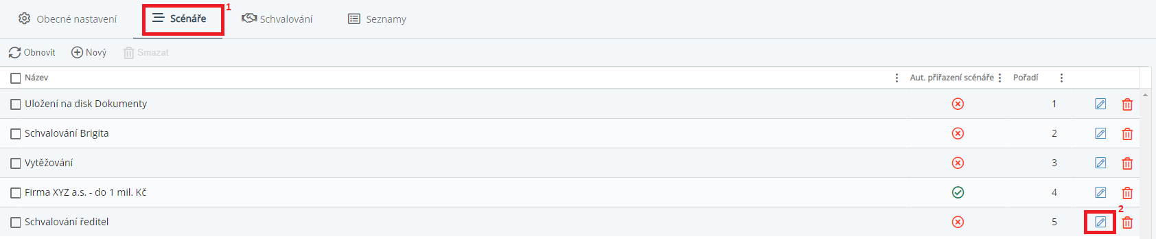 Znovu otevřete právě vytvořený scénář schvalování ikonkou editace (1).