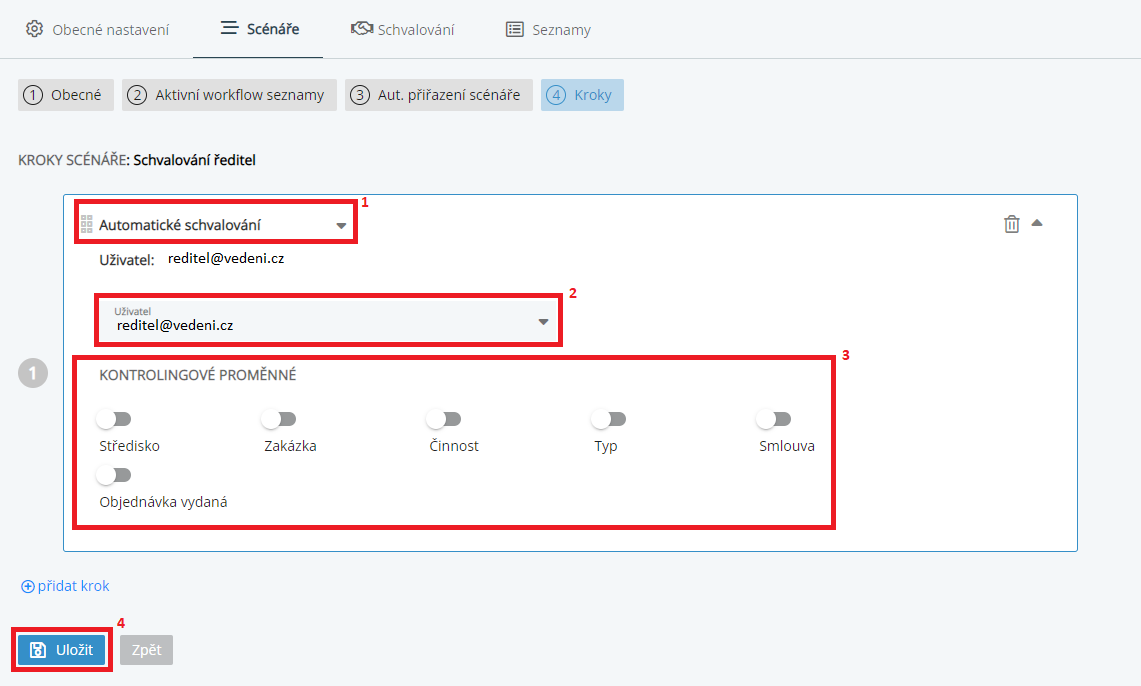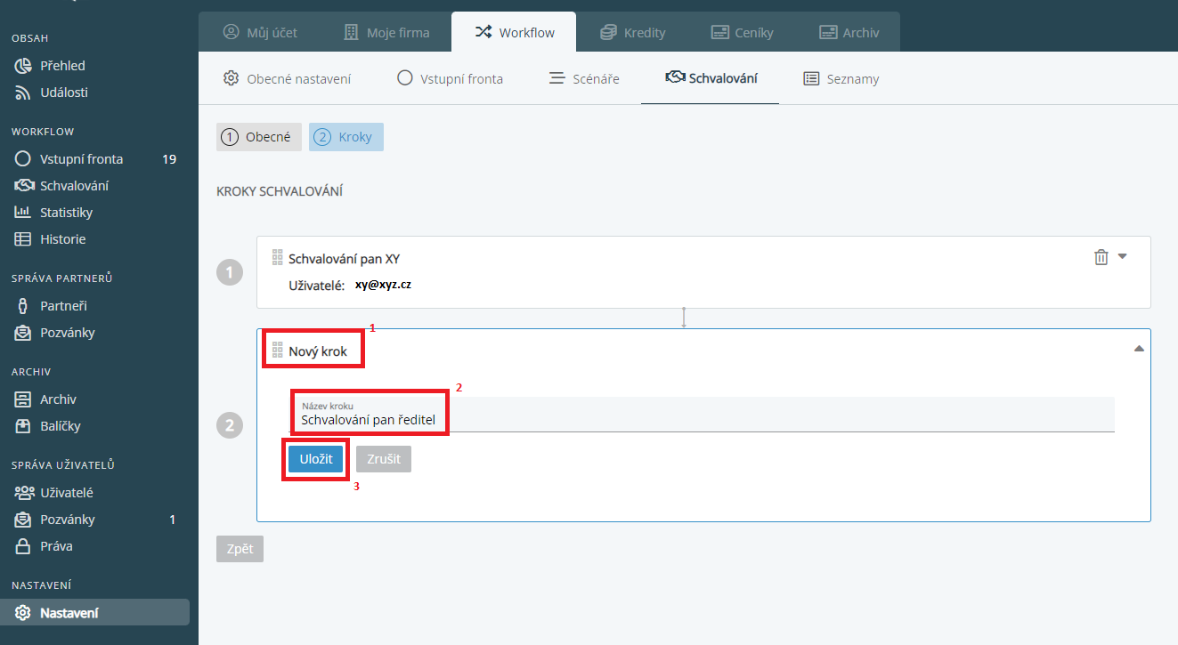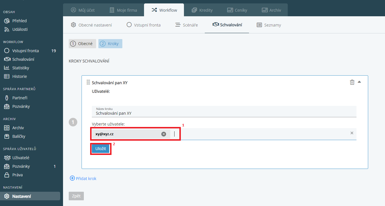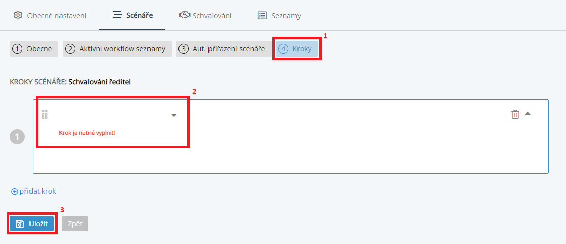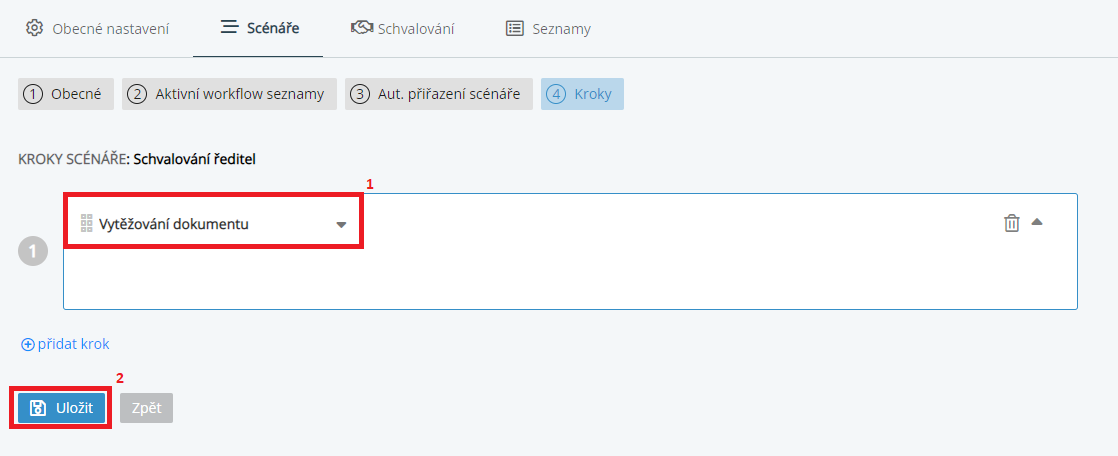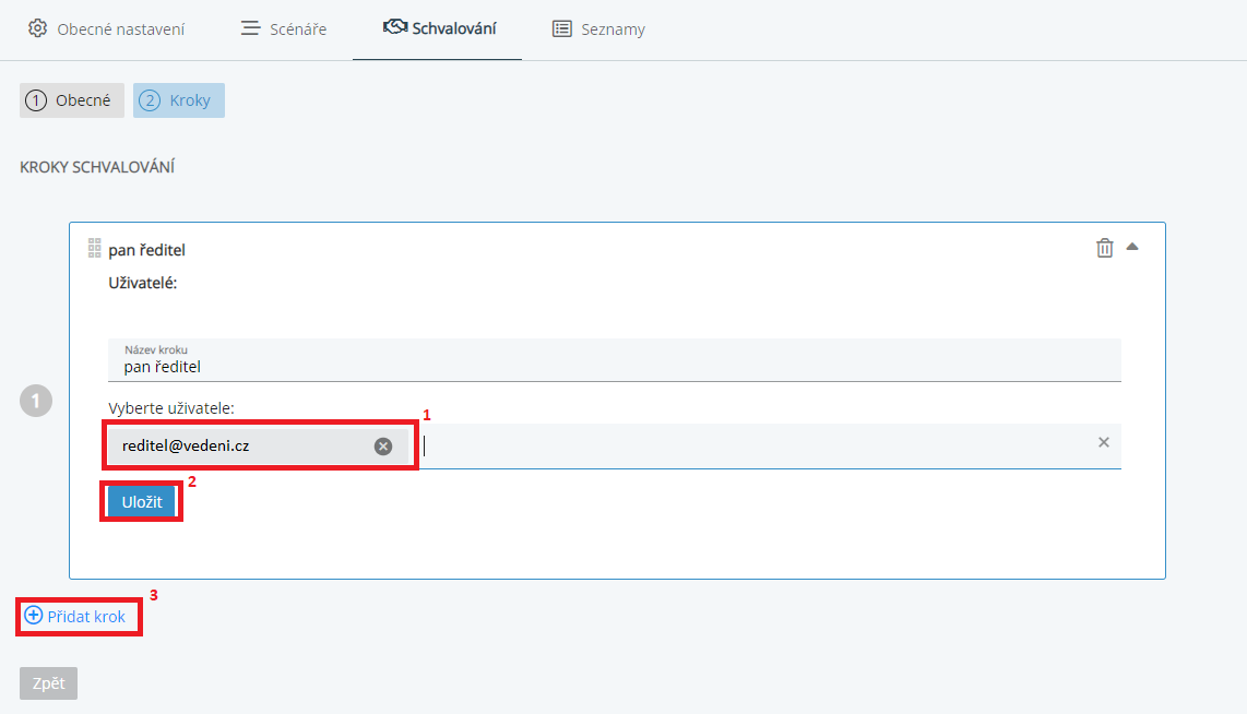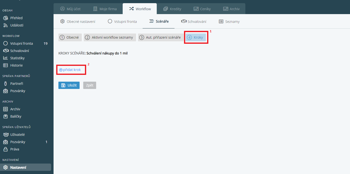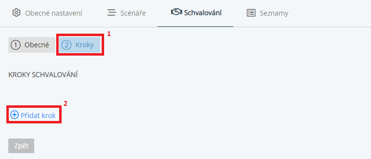 Nyní můžete specifikovat kroky (1) scénáře schvalování. Nový krok přidáte tlačítkem Přidat krok (2).