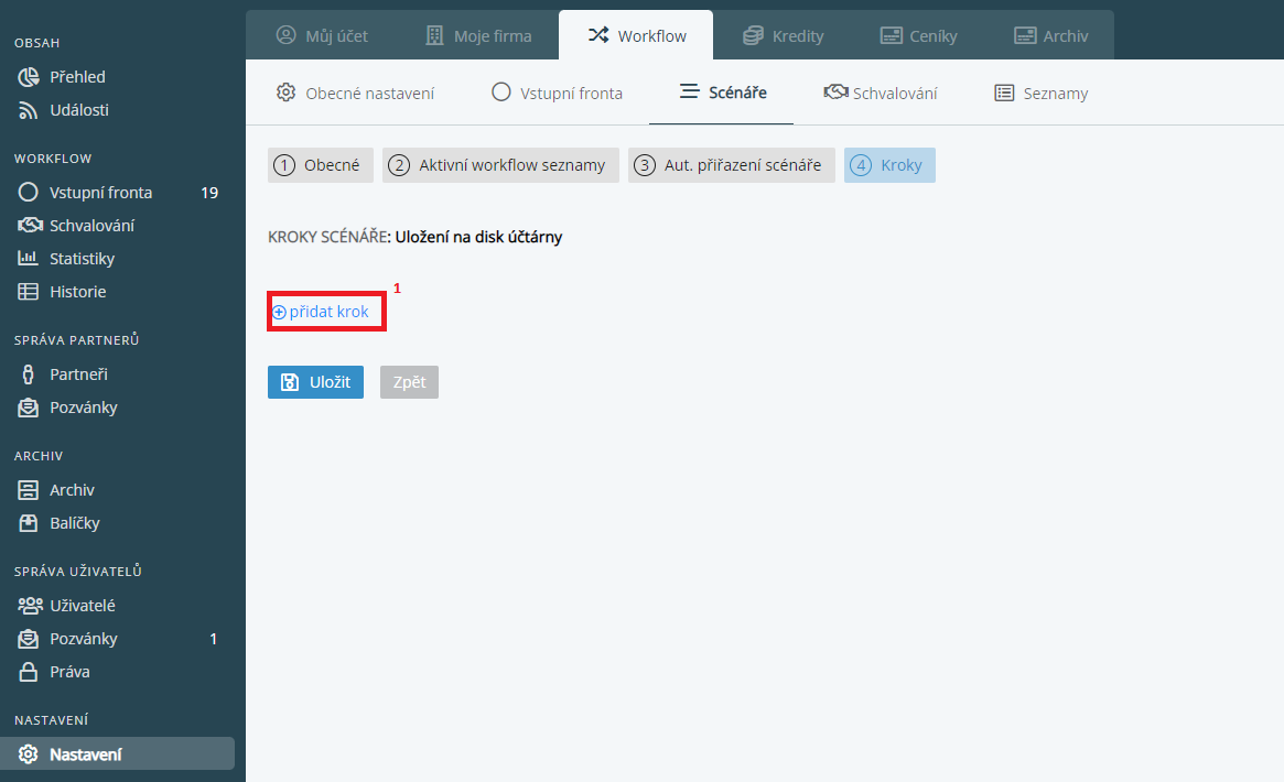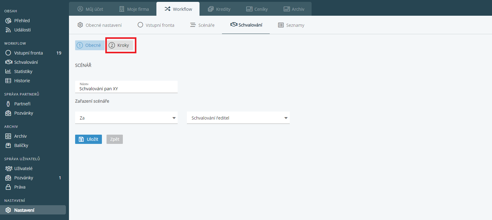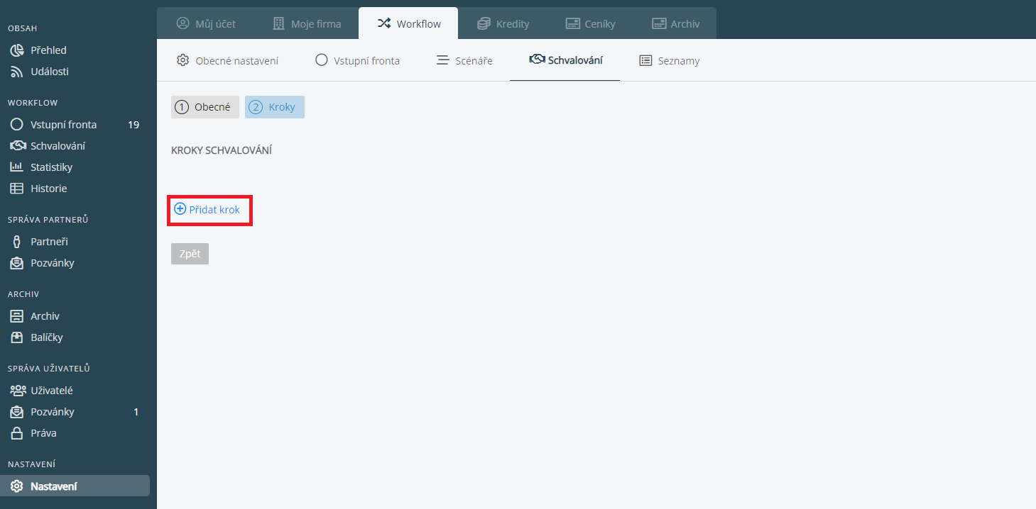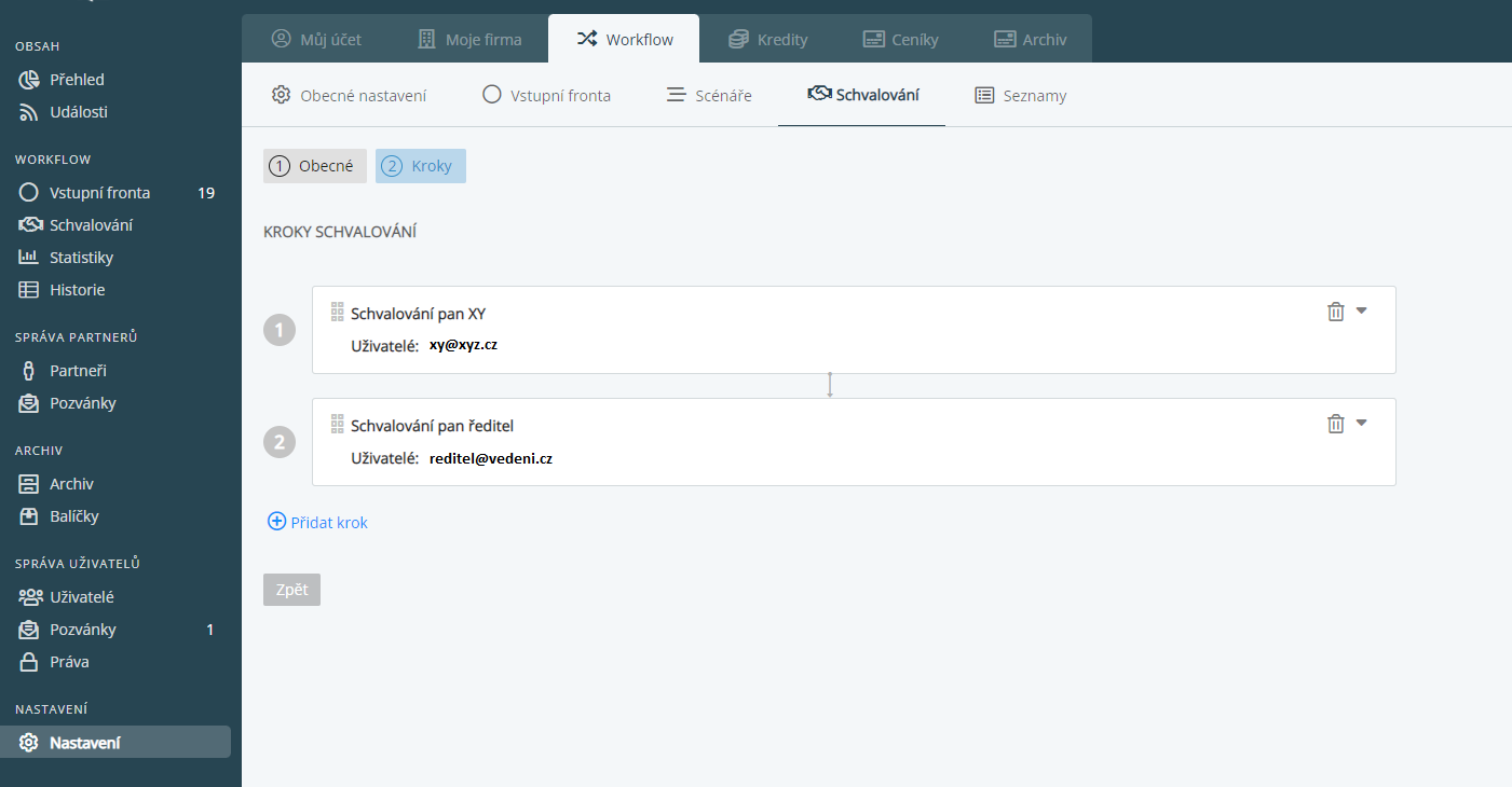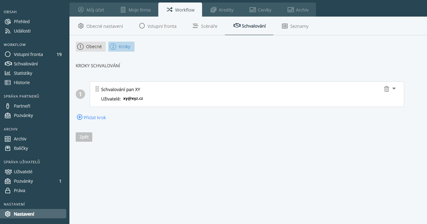 Nyní můžete specifikovat kroky (1) scénáře schvalování. Nový krok přidáte tlačítkem Přidat krok (2).