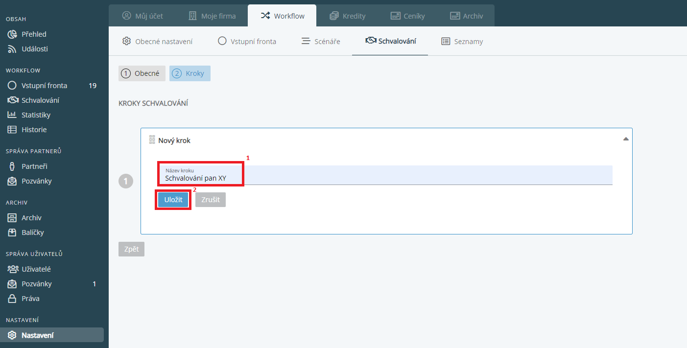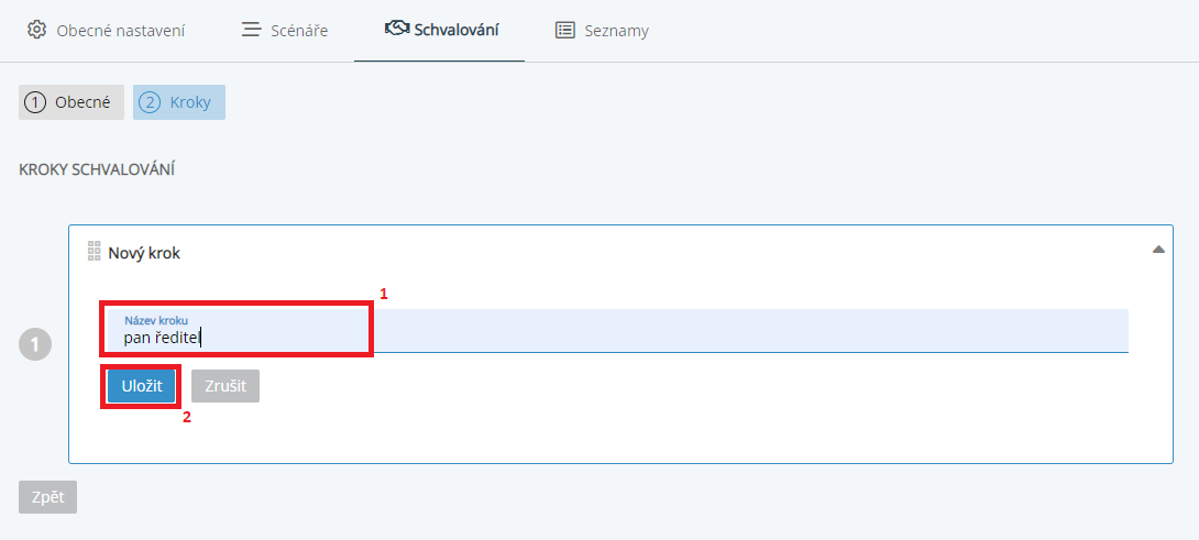 Zvolte vhodný název schvalovacího kroku (1) a klikněte na tlačítko Uložit (2).