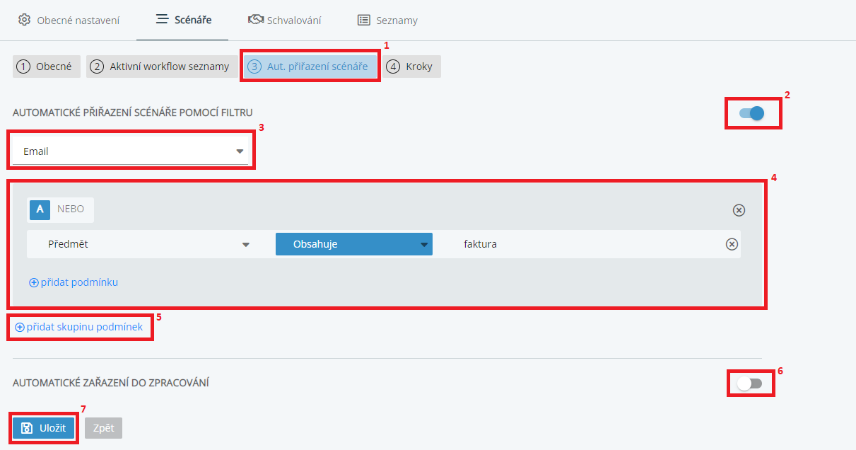 Po zapnutí přepínače Automatické přiřazení scénáře pomocí filtru (2) si zvolte zdroj (3), ze kterého faktura přijde (Email / Datarios) a pomocí jedné nebo více podmínek (4) specifikujte přiřazení faktury. Další podmínku nebo skupinu podmínek přidáte kliknutím na odkaz přidat skupinu podmínek (5).