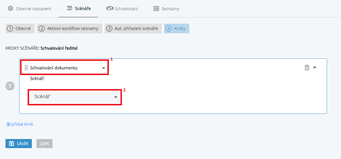 Při použití kroku Schvalování dokumentu (1) je třeba vybrat předem vytvořený Scénář schvalování (2).