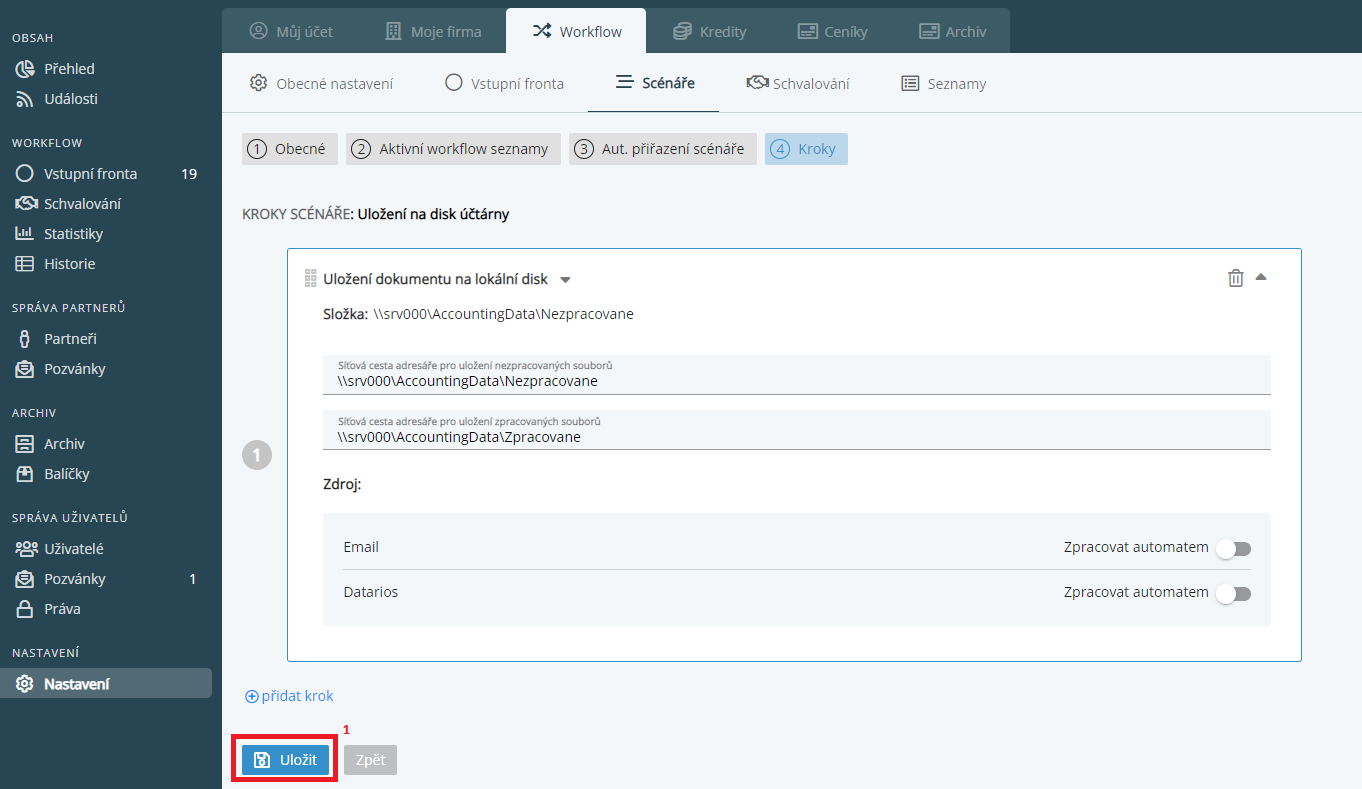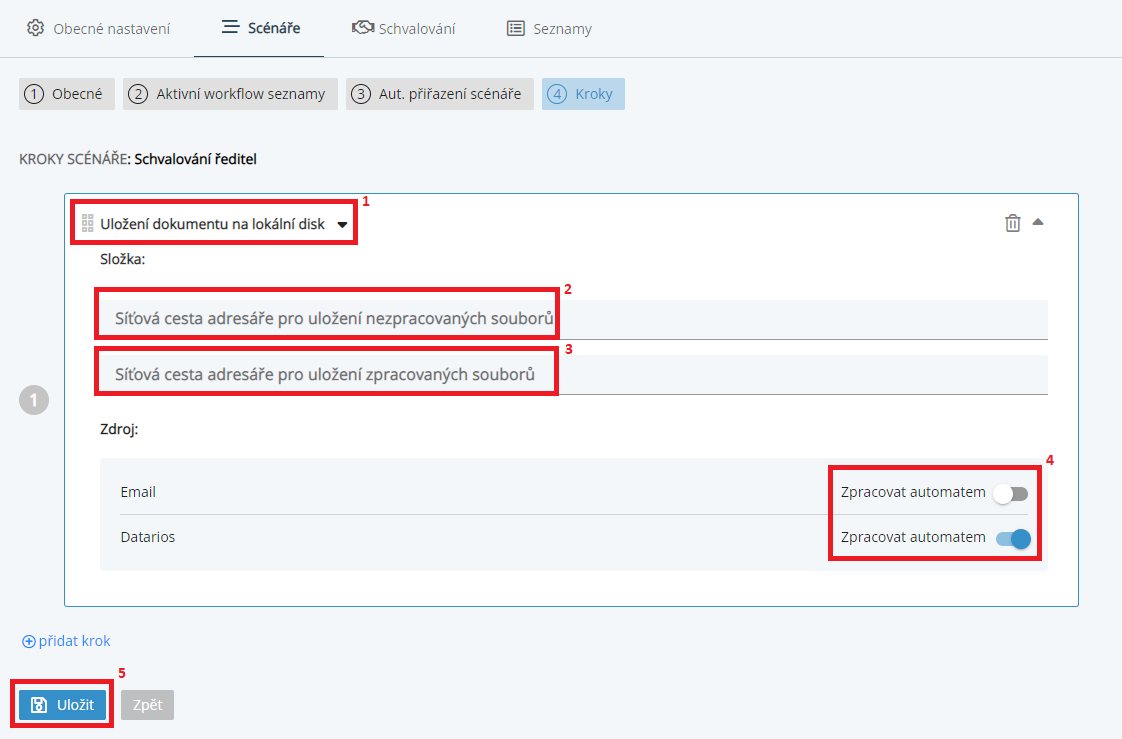 Krok Uložení dokumentu na lokální disk (1) umožní uložení kopie dokumentu na lokální úložiště. Je třeba vyplnit adresáře pro nezpracované (2) a zpracované (3) dokumenty (použijte síťovou cestu, např. \\DatariosData\Nezpracovane). Volitelně je možné zadat zpracování dokumentu automatem (4) podle zdroje faktury (Email / Datarios).