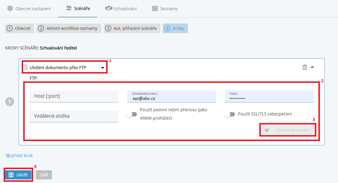 Krok Uložení dokumentu přes FTP (1) umožní uložení dokumentu na vzdálené úložiště pomocí protokolu FTP. Vyplňte nastavení připojení (2) a otestujte (3) jeho funčnost.