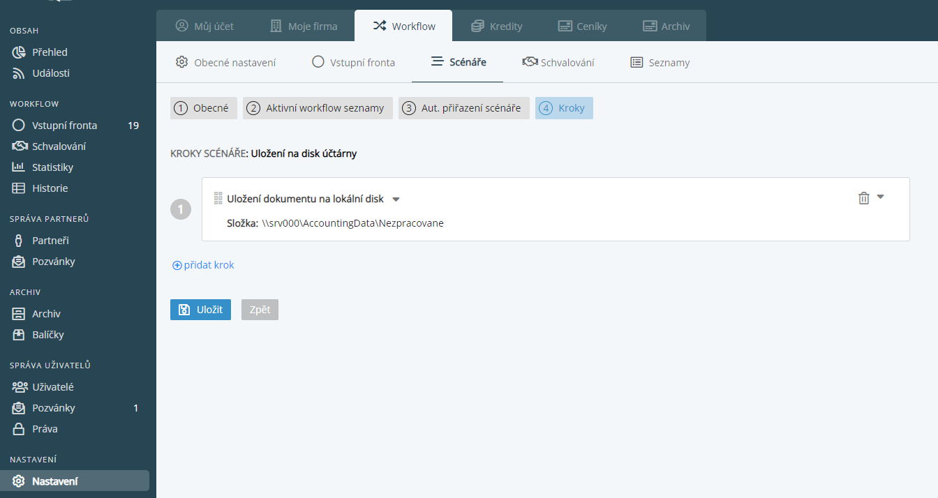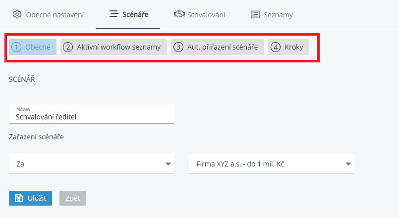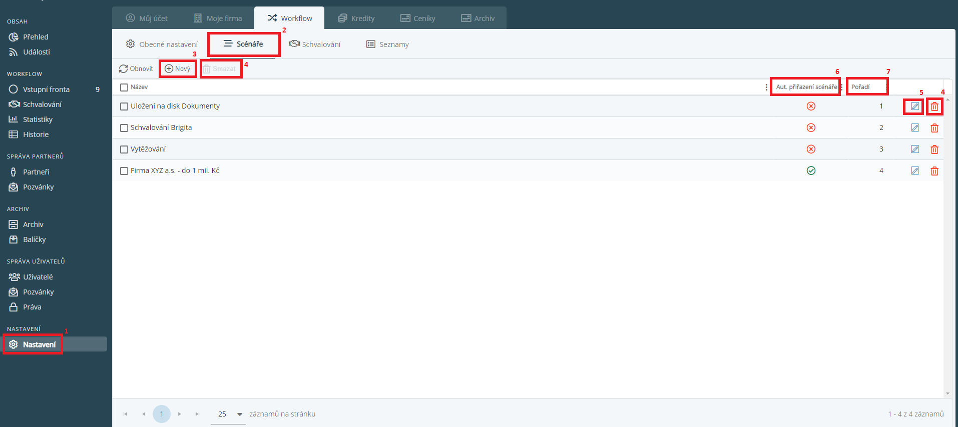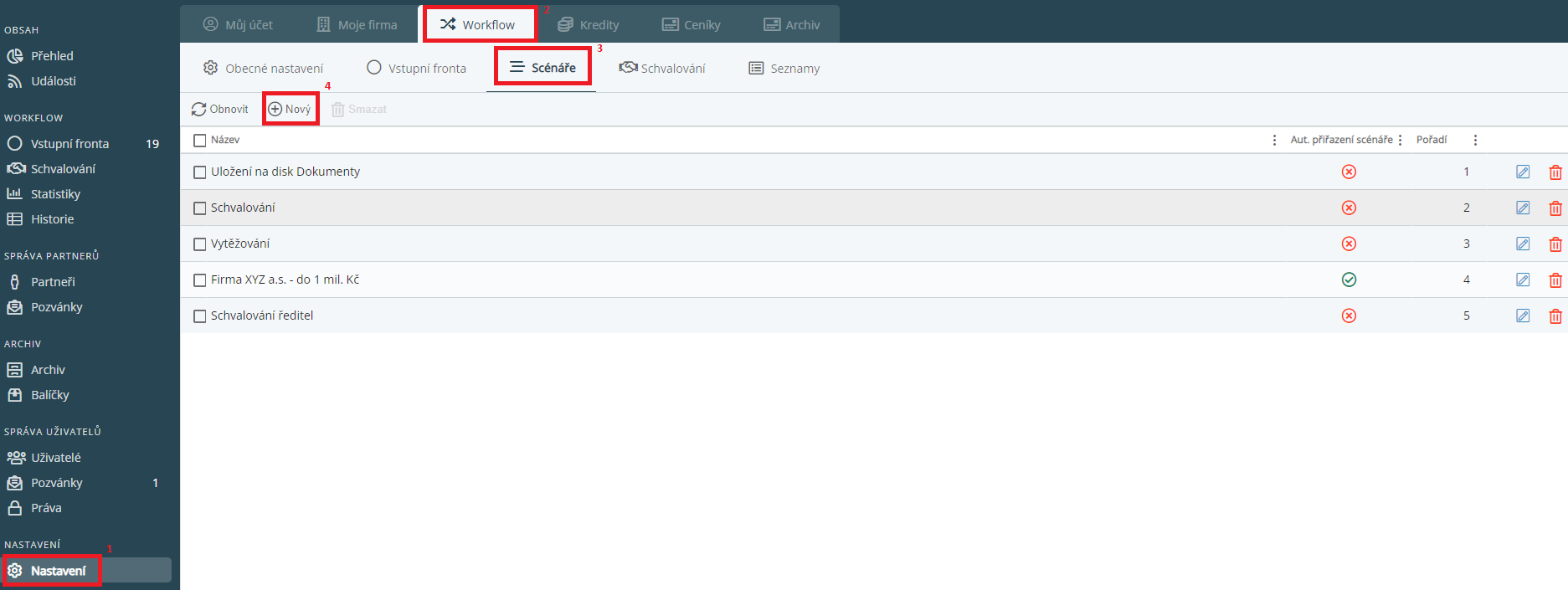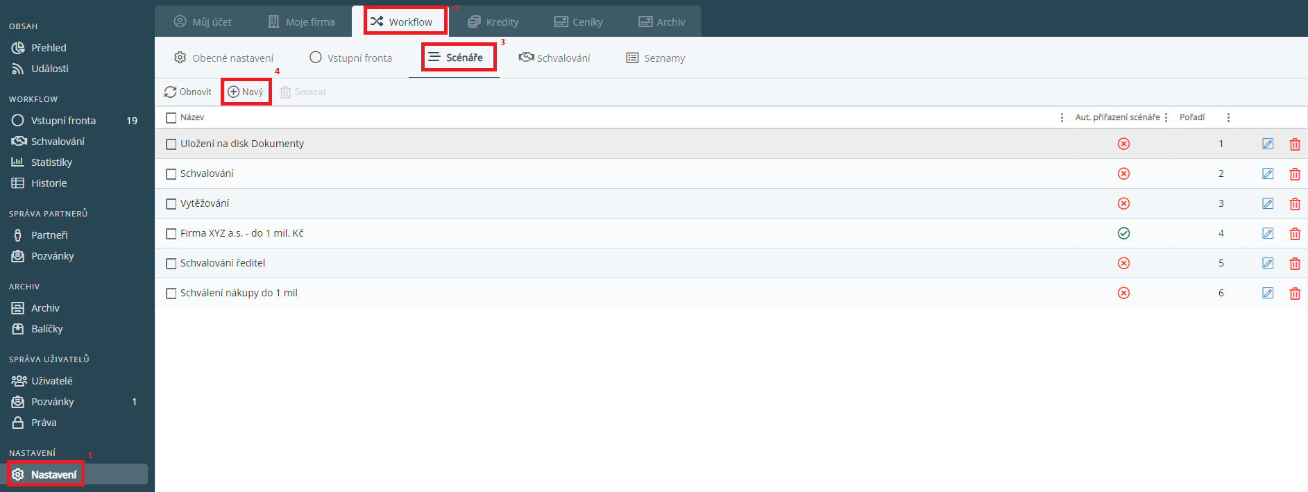 Nový scénář založíte kliknutím na tlačítko Nový (4) v menu Nastavení (1), záložka Workflow (2), Scénáře (3).