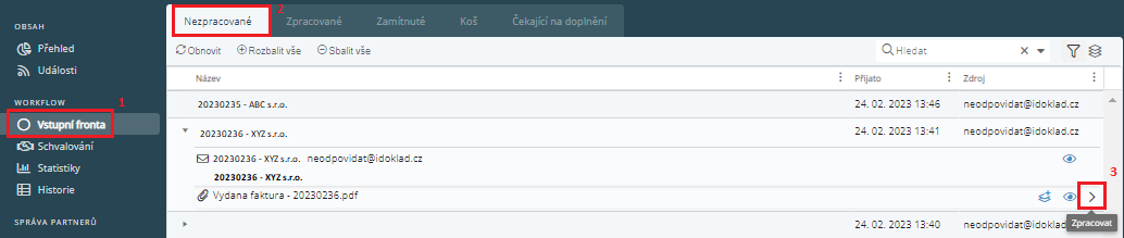 V menu Vstupní fronta (1), záložka Nezpracované (2) klikněte na ikonku Zpracovat (3).