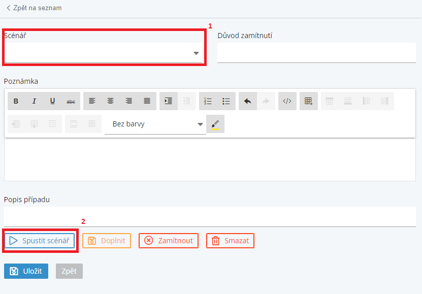 Volitelně můžete vyplnit pole Poznámka a Popis případu.