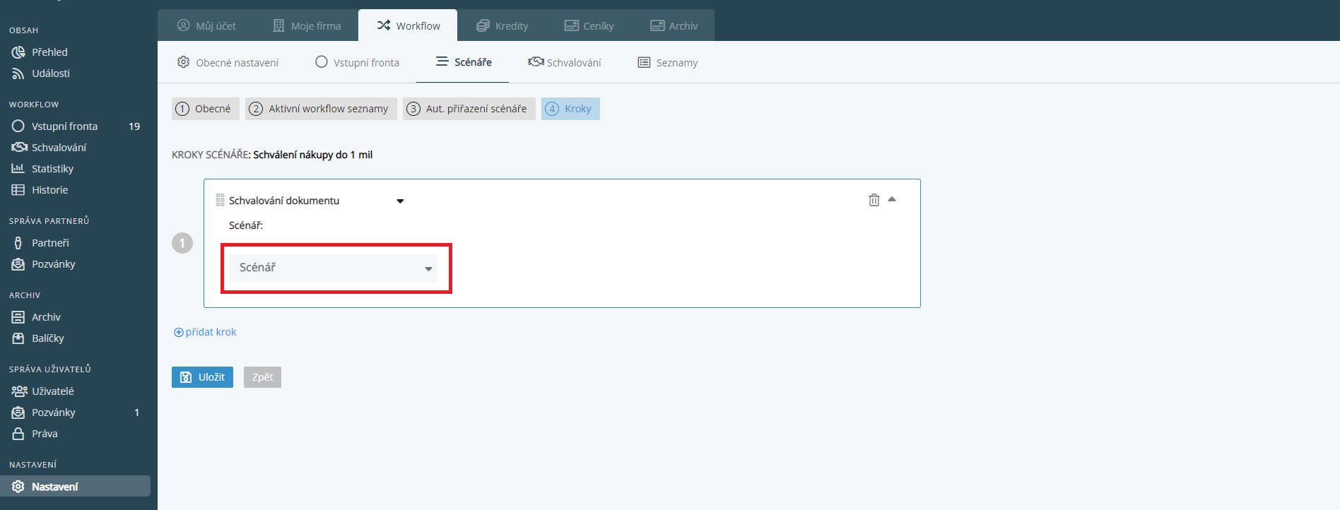 Vyberte krok Schvalování dokumentu. Nyní je třeba vytvořit a doplnit scénář schvalování.