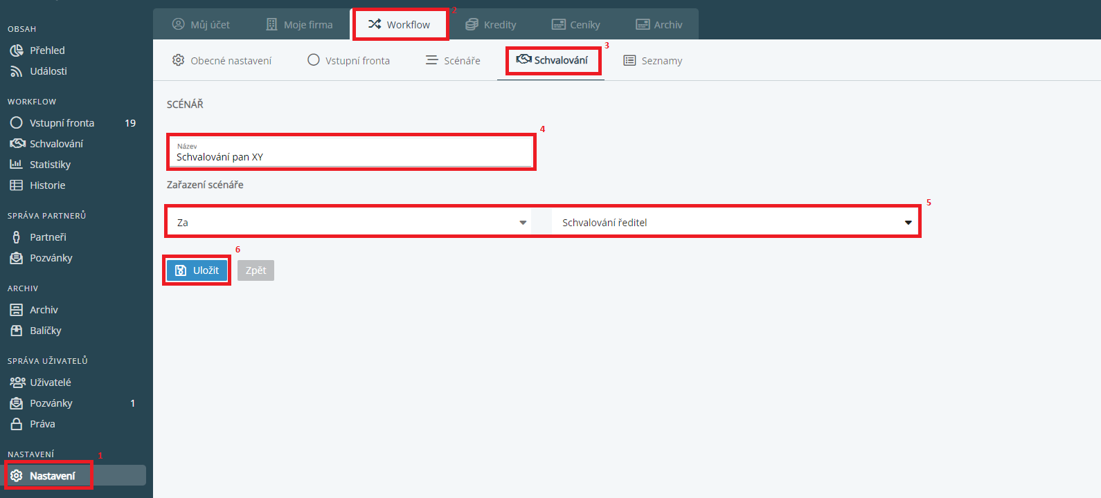 V menu Nastavení (1), záložka Workflow (2), Schvalování (3) vytvořte nový scénář. Vyplňte název (4) a zařazení (5). Uložte kliknutím na tlačítko Uložit (6).