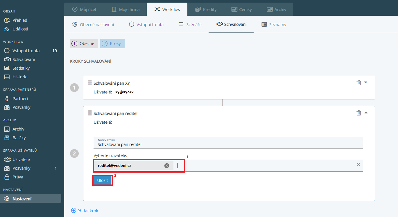 Vyberte jednoho či více schvalovatelů (1) a uložte (2).