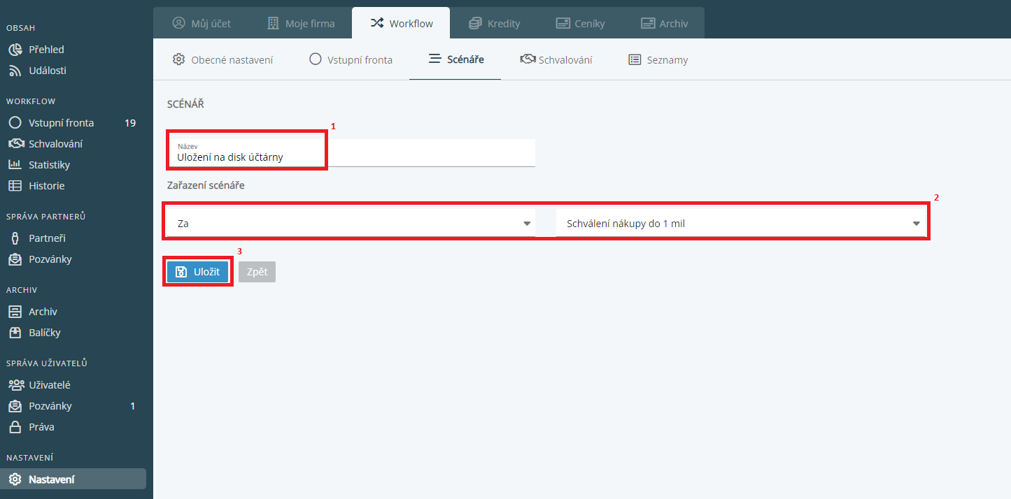 Vyplňte název (1) scénáře, jeho zařazení (2) v přehledu scénářů a uložte tlačítkem Uložit (3).