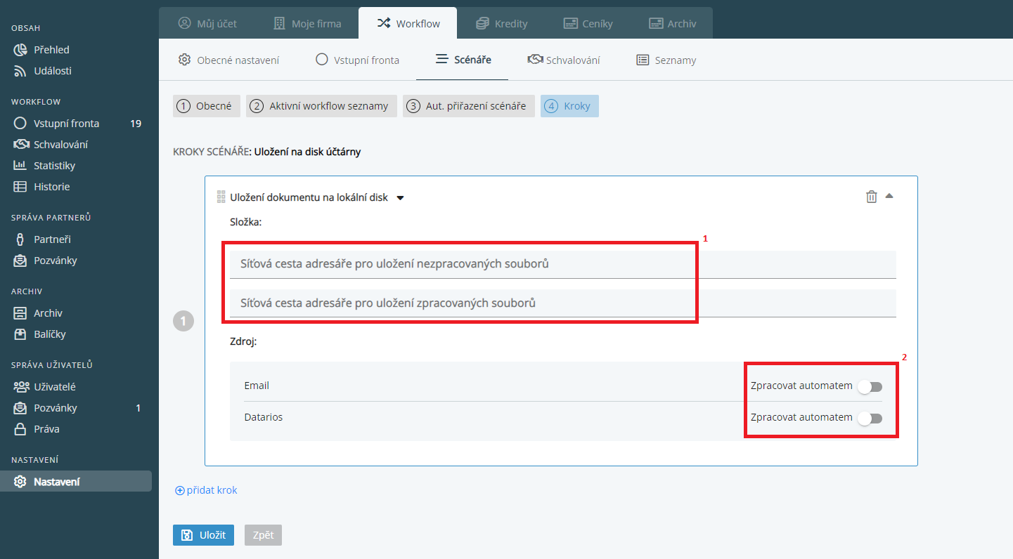 Zadejte cestu pro adresáře zpracovaných a nezpracovaných souborů (1). Volitelně můžete zapnout Zpracovat automatem (2). Klikněte na tlačítko Uložit.