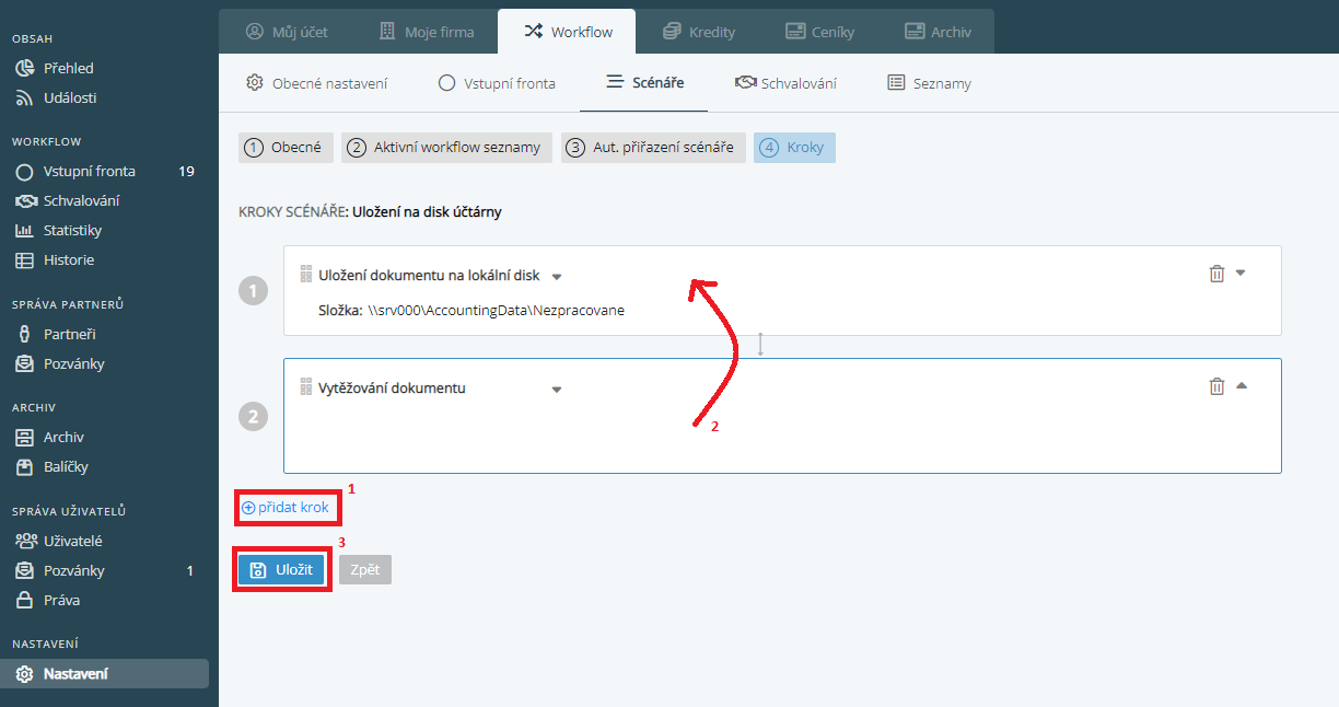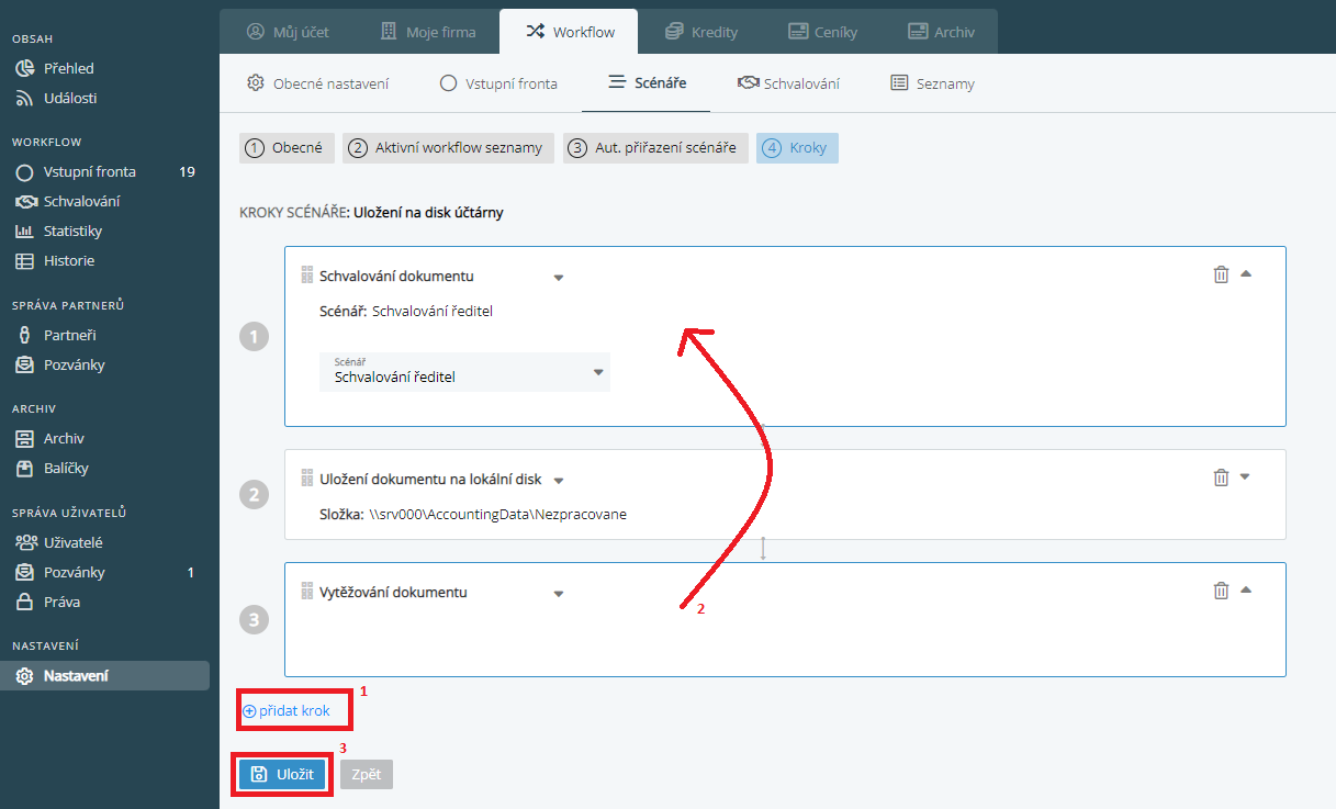 V záložce Kroky klikněte na odkaz Přidat krok (1) a přidejte krok Vytěžování dokumentu (2). Přesuňte pomocí myši tento krok na začátek scénáře. Klikněte na tlačítko Uložit (3).