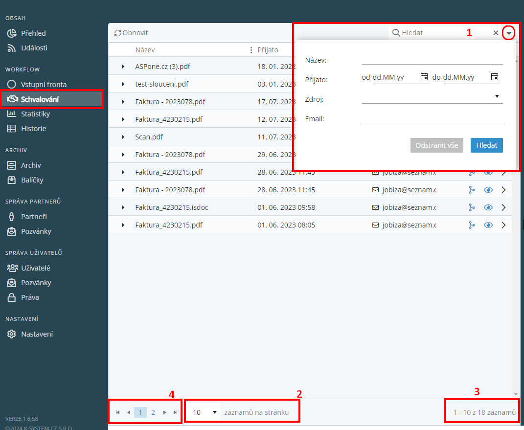 Počet dokladů ke schválení úvádí číslo v zápatí obrazovky pod seznamem dokladů (3). V případě většího počtu záznamů se lze posunout na další stránku (4).