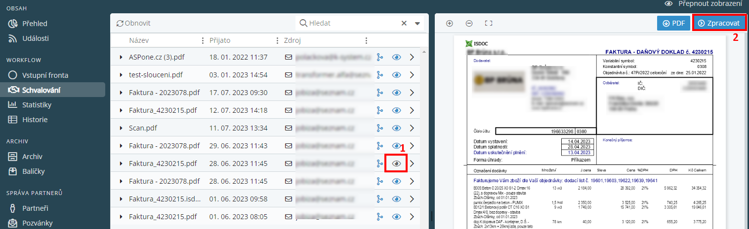 K zobrazení náhledu dokladu slouží ikona očička (1). Náhled dokladu je zobrazen v pravé části obrazovky.