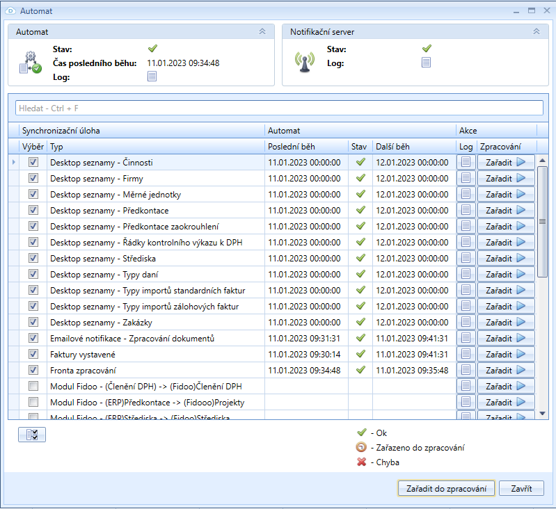 Tlačítkem seznamu (2) vyberete všechny synchronizační úlohy a tlačítkem Zařadit do zpracování (3) se u všech nastaví další běh synchronizační úlohy na nejbližší interval.