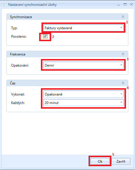 Tlačítkem Ok (5) ukončíte nastavování nové synchronizační úlohy. Na závěr stiskněte tlačítko Uložit v přehledu synchronizačních úloh.