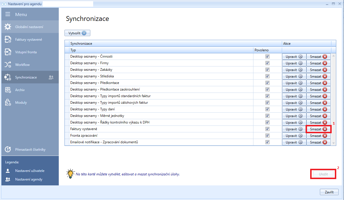 Smazání synchronizační úlohy provedete z přehledu nadefinovaných synchronizačních úloh stisknutím tlačítka Smazat (1). Provedené změny uložíte tlačítkem Uložit (2).