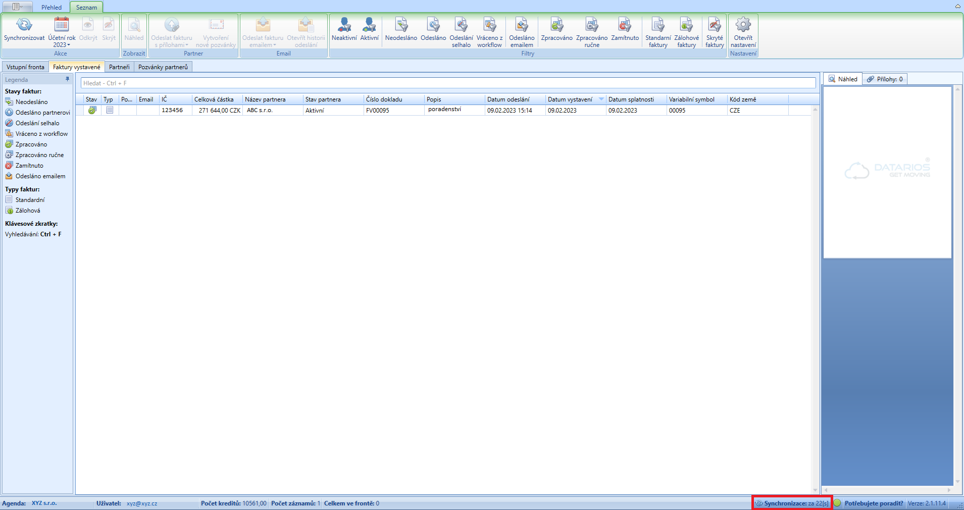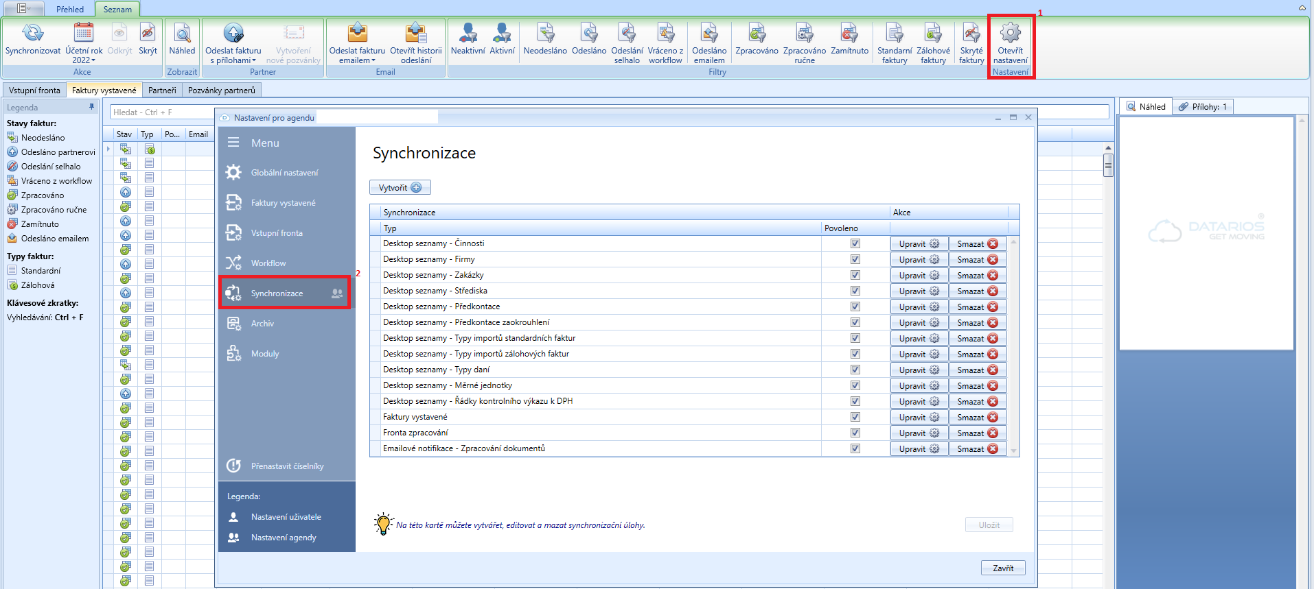 Přehled naleznete v desktopové aplikaci Datarios pod ikonkou Otevřít nastavení (1) v menu Synchronizace (2).