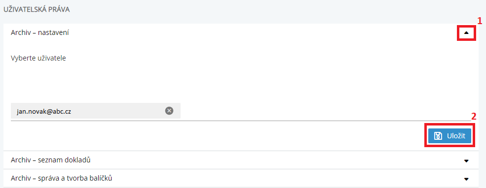 Pod každým jednotlivým typem oprávnění naleznete přehled uživatelů, kteří tímto oprávnění disponují a lze zde přidat či odebrat uživatele. Změnu nastavení je třeba potvrdit tlačítkem Uložit.