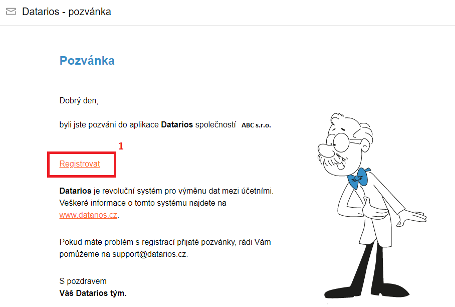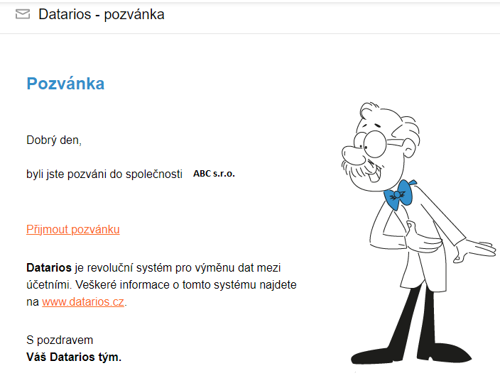 Kliknutí na odkaz Přijmout pozvánku přesměruje na stránky Datarios, kde se uživatel může nyní přihlásit do nové agendy.