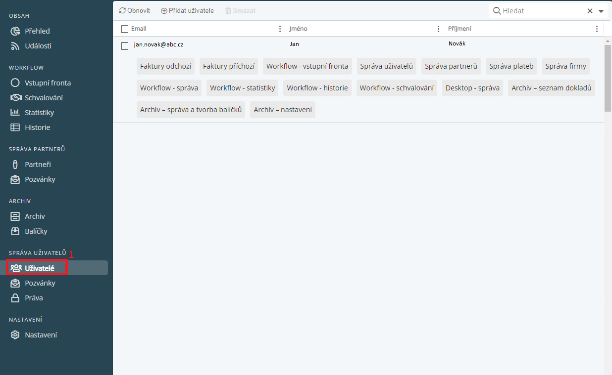 Seznam všech uživatelů pro danou agendu včetně jejich oprávnění naleznete v menu Uživatelé (1). Seznam lze prohledávat na základě emailu, jména či příjmení.